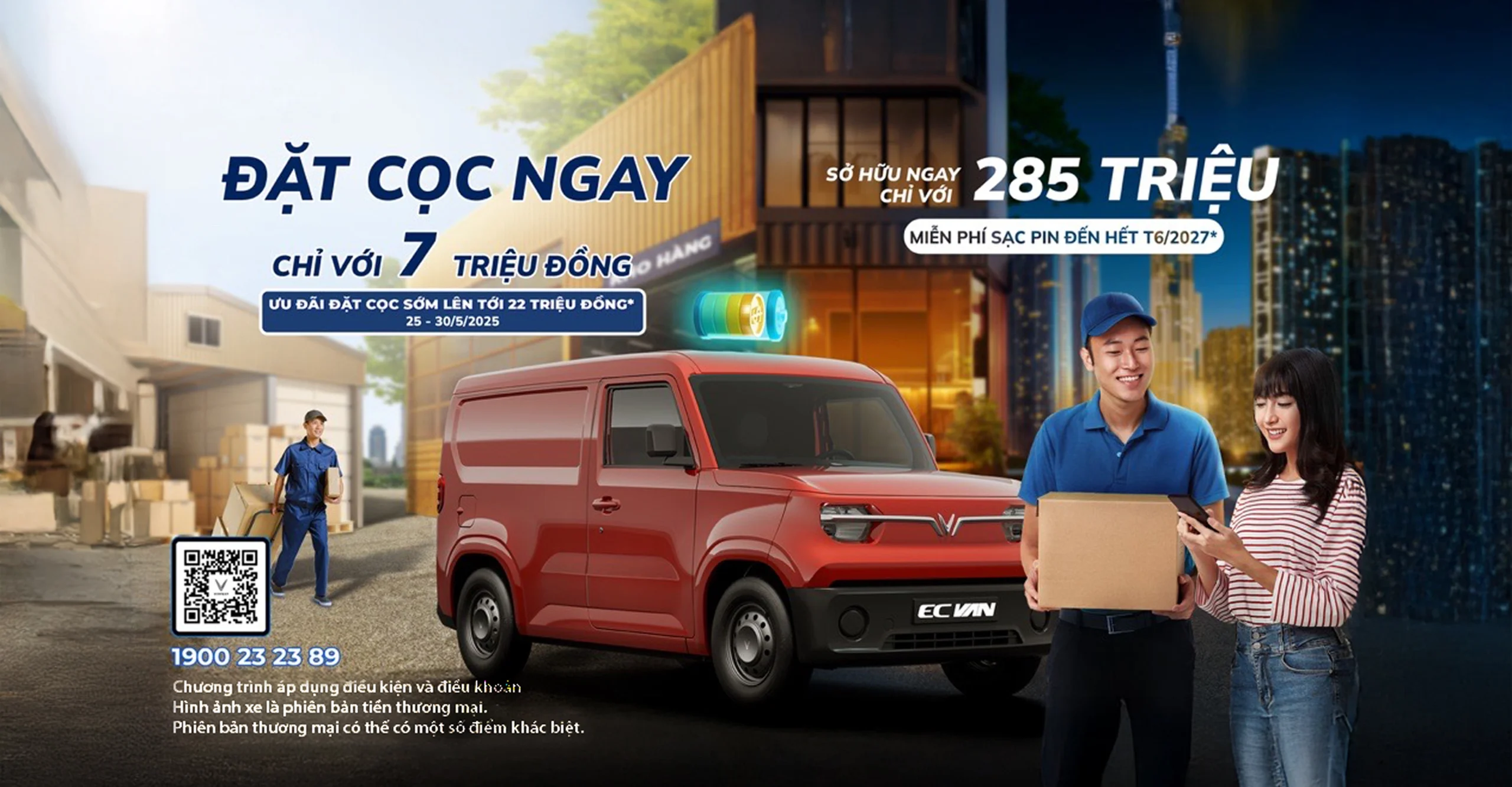 VinFast EC Van (E‑City Van) là mẫu xe mini van chạy điện đầu tiên tại Việt Nam, tối ưu cho nhu cầu vận chuyển đô thị và logistics. Với thiết kế nhỏ gọn (3.767 × 1.680 × 1.790 mm), bán kính vòng quay chỉ 5,1 m, xe phù hợp luồn lách trong nội thành đông đúc. Cabin gồm 2 chỗ ngồi và khoang chở hàng dung tích lên đến 2.600 lít, chịu tải tối đa 600 kg. Động cơ điện 30 kW (tương đương ~40 hp) cùng mô-men xoắn 110 Nm tích hợp cầu sau (RWD) mang lại khả năng vận hành nhẹ nhàng, tốc độ tối đa 75 km/h. Pin dung lượng 17 kWh dùng công nghệ LFP, hỗ trợ sạc nhanh 10→70% chỉ trong 42 phút (tại sạc 19,4 kW). Hệ thống an toàn cơ bản gồm ABS, EBD, TCS và ESS. Xe dự kiến giao khách từ tháng 11/2025, bảo hành 5 năm/130.000 km (xe), 7 năm/160.000 km (pin).Thư viện